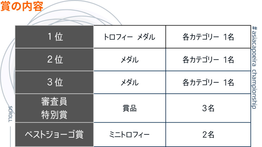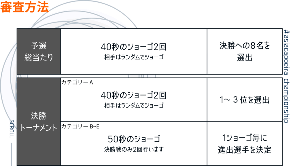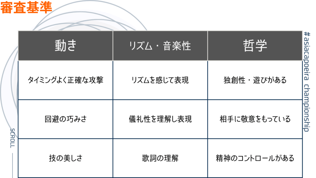 ジャッジで結果が決まるイベントですが「相手を倒した人」が決勝へ進む大会ではありません。ジャッジは優越を決めるためではなく、普段のカポエイラで隠されている大事な事を表面化させるために取り入れています。なので勝敗よりもあなたの思う「良いカポエイラ」の発揮を胸に大会に参加してもらえたら、誰よりも充実した挑戦になると思います。そんな大会に実際に出場して、1回きりのゲームに真剣に向き合う機会は意外と無いものです。