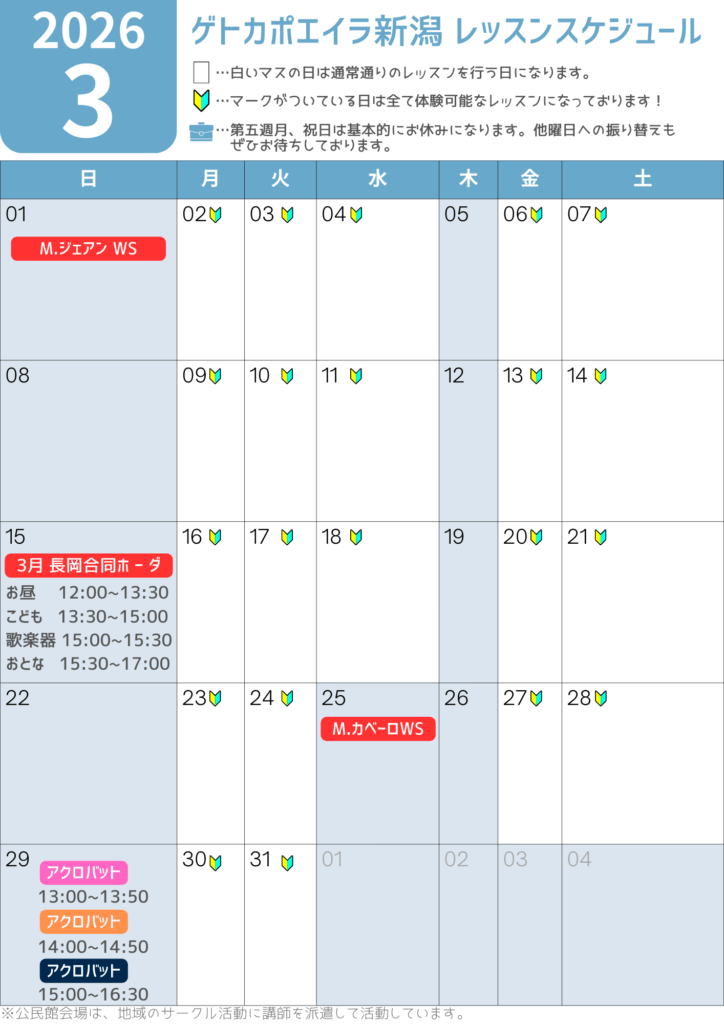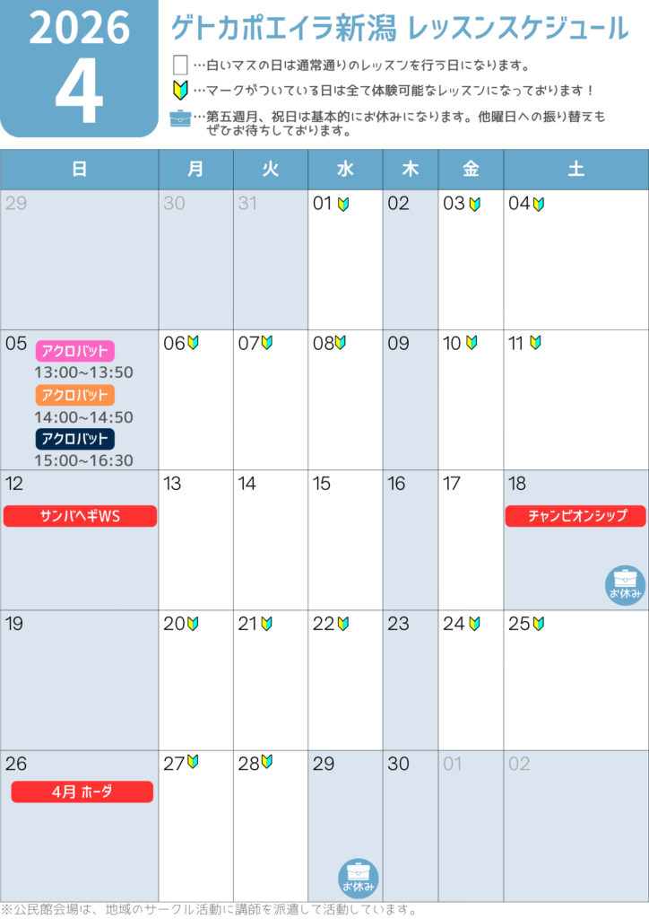 ゲトカポエイラ新潟 練習日程 ●ホーダ(カポエイラのゲームの日)●アクロバットクラス 鳥屋野総合体育館 体操練習室 教室案内に戻る 体験のお申し込み ゲトカポエイラ年間予定 (確定)3/25 メストレカベーロWS(予定)4/12 サンバヘギWS(確定)4/18 チャンピオンシップ(予定)7/26 東京BATIZADO(確定)8/2 石川本部BATIZADO(予定)9/19-20 子供合宿 変更の可能性が高い事をご理解ください。全ての教室のイベントは記載できません。各教室のSNS等からご確認ください。上記イベントの詳細については先生に直接聞いてください!