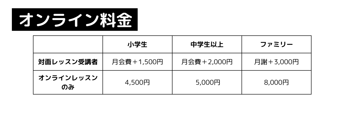 | 月曜日 | 小学生も参加可能 | 19:20〜20:00 |