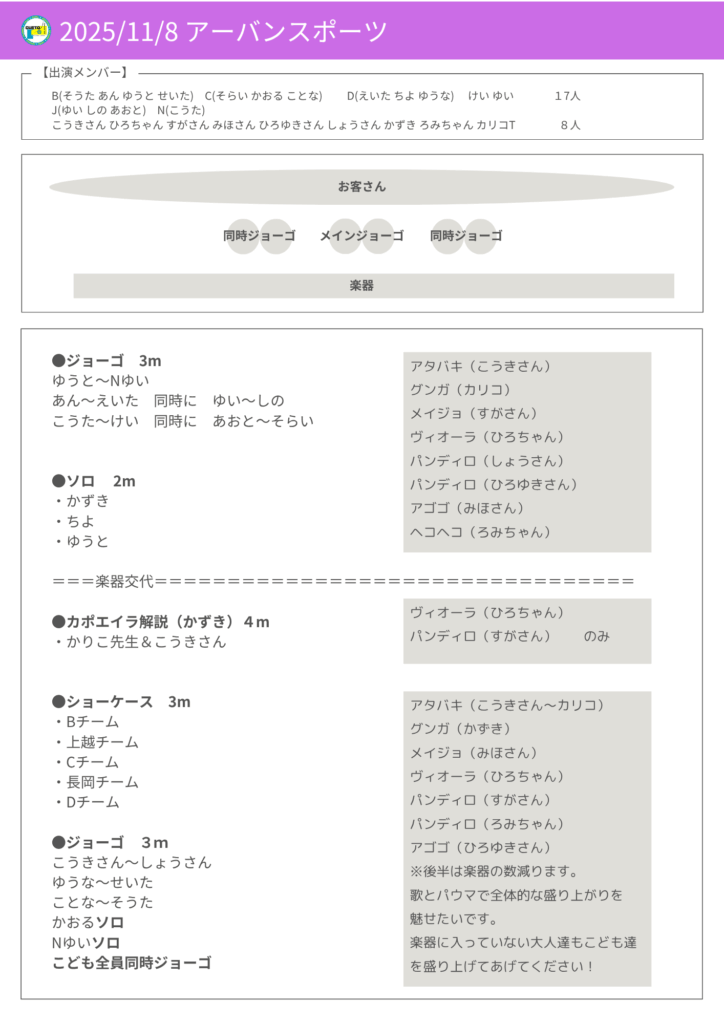 最初から全開の音楽とジョーゴとソロで盛り上げ、一度解説で落とします。その後ショーケースと楽器で魅せた後に、歌を復活させカポエイラらしくジョーゴで魅せてください。最後は広がれる範囲をすべて使ってこども達が9組同時にジョーゴを行い終了します。